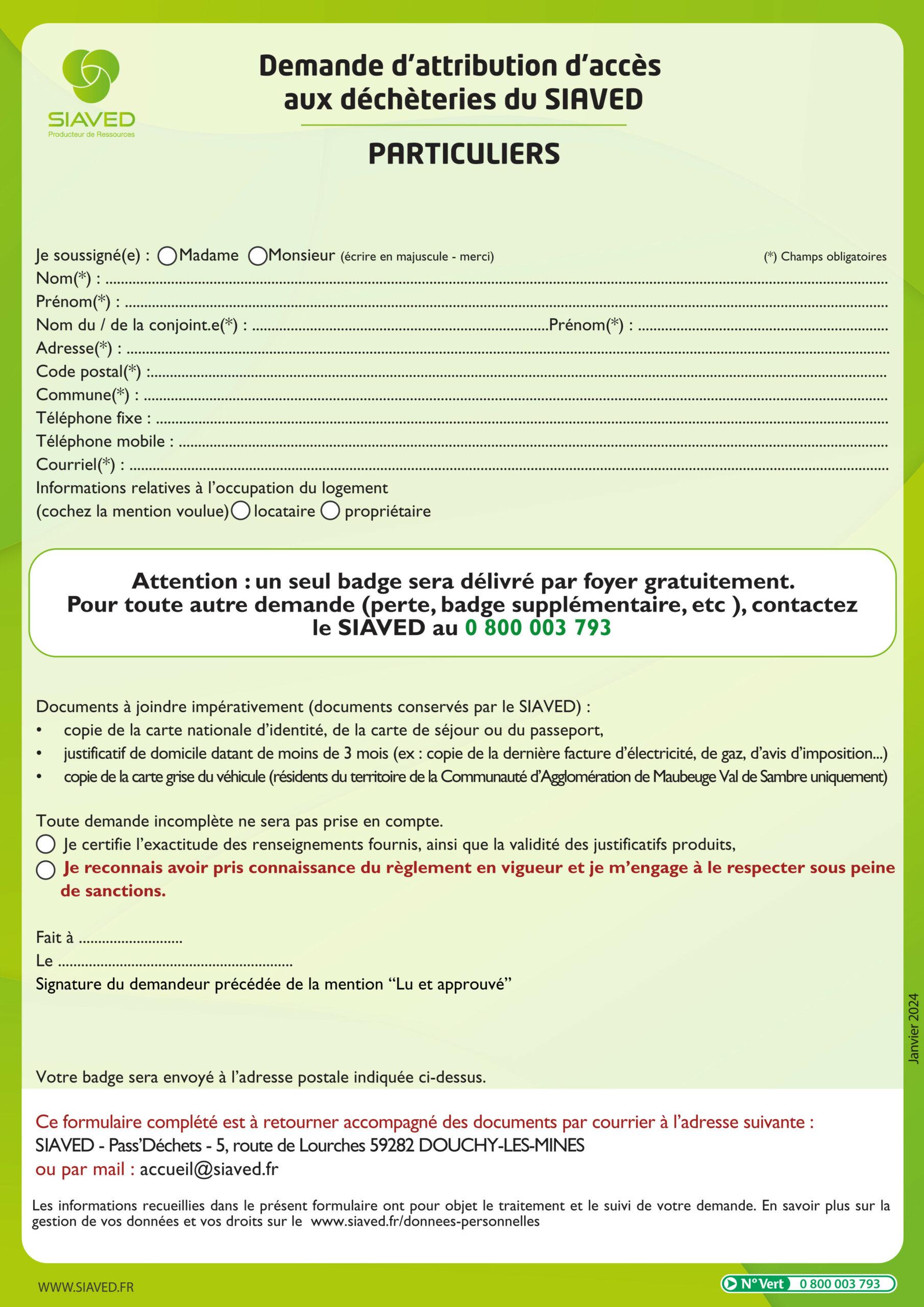 Un nouveau formulaire à jour, ci-dessous, est disponible en version numérique sur le site internet du SIAVED via le lien suivant https://www.siaved.fr/votre-carte-d-acces